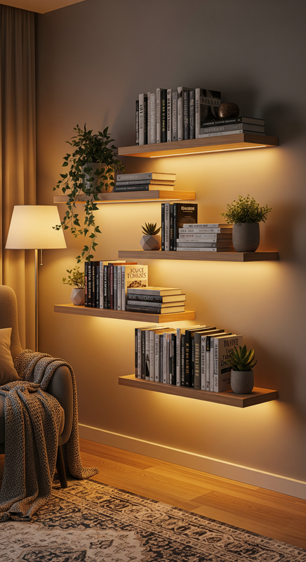 Add LED strips behind your floating shelves to highlight decor and add depth to your wall design.