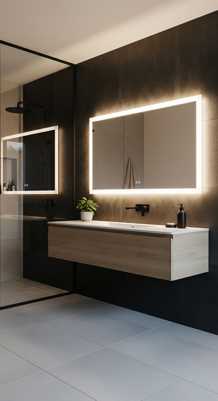Hidden lights behind the mirror create a soft halo effect — perfect for relaxing baths or nighttime routines.