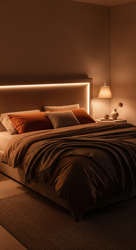 Add hidden LED strips along the ceiling edges to create a soft, diffused light that makes your room feel bigger and more serene.