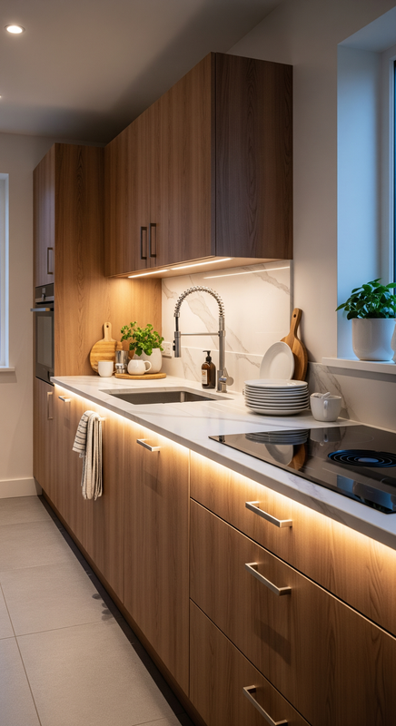 Hidden strip lights under cabinets provide both function and beauty — perfect for late-night snacks or subtle evening ambiance.