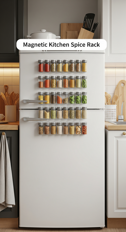 Keep your spice jars within reach by using magnetic racks on your fridge or wall. This space-saving idea frees up counter space and keeps your kitchen looking clean and modern.
